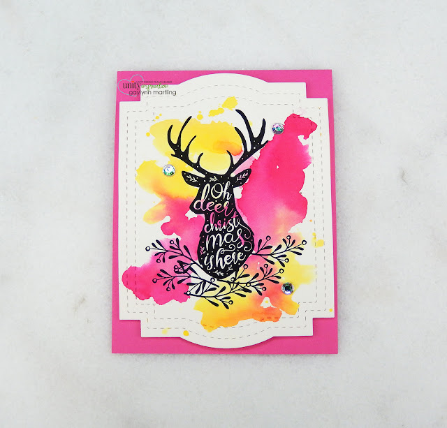 I began by stamping and trimming the deer and leaves panel. Next, I mixed water with Color Burst watercolor powders to make diluted watercolors. These were added to the deer panel to create these vibrant non-traditional holiday colors. Finally, everything was dried and assembled to finish.