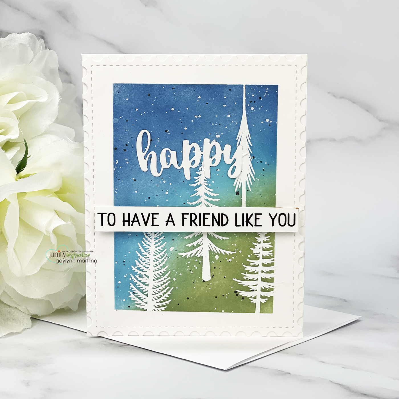 Here are helpful tips for this card with embossing, ink blending & masking techniques. To begin, stamp the trees with embossing ink onto one side of a prepared card front. Also, add white embossing powder and heat set the trees. Next, mask the four edges of the tree panel using repositionable tape like Post-It tape. Then, add three shades of distress ink blending from green near the trees to light and dark blue. Optional, add paint splatters over the trees scene in white and black. Once dry, remove the masking tape. For the sentiments, die-cut the happy then stamp and trim the longer sentiment. Finally, layer it all onto the card base, to finish.